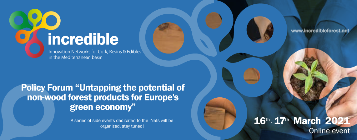 El proyecto INCREDIBLE, financiado con fondos europeos, celebrará un foro político los días 16 y 17 de marzo de 2021 para debatir las acciones necesarias para posicionar la PFNM como un pilar de la bioeconomía europea. El Foro está dirigido a los responsables políticos de la UE, nacionales, regionales y locales y las partes interesadas clave en las cadenas de valor de los PFNM (asociaciones de propietarios forestales, productores y procesadores, organizaciones de consumidores, industrias, ONG, instituciones públicas, etc.).